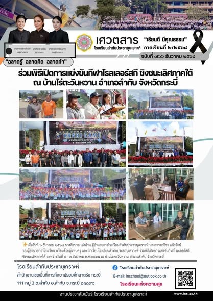 และนักเรียนโรงเรียนลำทับประชานุเคราะห์ ร่วมพิธีเปิดการแข่งขันกีฬาโรลเลอร์สกี ชิงชนะเลิศภาคใต้ ระหว่างวันที่ ๕ - ๗ ธันวาคม พ.ศ.๒๕๖๘ ณ บ้านไร่ตะวันหวาน อำเภอลำทับ จังหวัดกระบี่ โดยมีนักกีฬาโรลเลอร์สกี โรงเรียนลำทับประชานุเคราะห์ เข้าร่วมการแข่งขันในรายการนี้