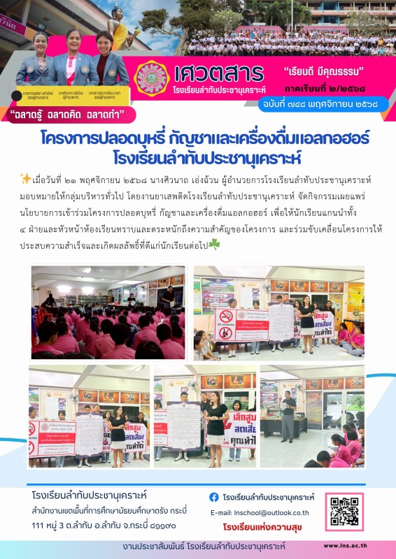 เมื่อวันที่ ๒๑ พฤศจิกายน ๒๕๖๘ นางศิวนาถ เอ่งฉ้วน ผู้อำนวยการโรงเรียนลำทับประชานุเคราะห์ มอบหมายให้กลุ่มบริหารทั่วไป โดยงานยาเสพติดโรงเรียนลำทับประชานุเคราะห์