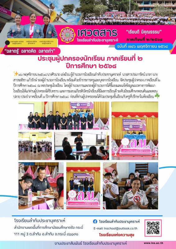 พร้อมด้วยข้าราชการครูและบุคลากรโรงเรียน จัดประชุมผู้ปกครอง ภาคเรียนที่ ๒ ปีการศึกษา ๒๕๖๘ ณ หอประชุมโรงเรียน โดยผู้อำนวยการและรองผู้อำนวยการได้ชี้แจงและแจ้งข้อมูลแนวทางการพัฒนาโรงเรียนให้แก่ท่านผู้ปกครองได้รับทราบ และการมอบเเกียรติบัตรนักเรียนที่มีผลการเรียนดี ระดับมัธยมศึกษาตอนต้นและตอนปลาย ประจำภาคเรียนที่ ๑ ปีการศึกษา ๒๕๖๘ ก่อนที่ท่านผู้ปกครองจะได้ร่วมประชุมชั้นเรียนกับครูที่ปรึกษาในห้องเรียน