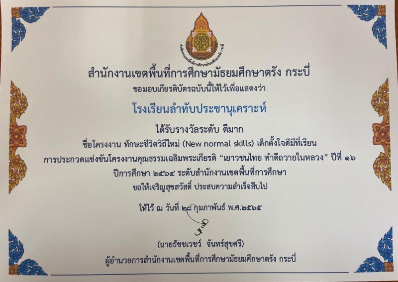 ยินดีกับโรงเรียนลำทับประชานุเคราะห์ กับรางวัลโครงงานคุณธรรมเฉลิมพระเกียรติ "เยาวชนไทย ทำดีถวายในหลวง" ปีที่ 16 ได้รับรางวัลระดับดีมาก ชื่อโครงงาน ทักษะชีวิตวิถีใหม่ (New normal skills) เด็กตั้งใจดีมีที่ยืน ระดับสำนักงานเขตพื้นที่การศึกษา