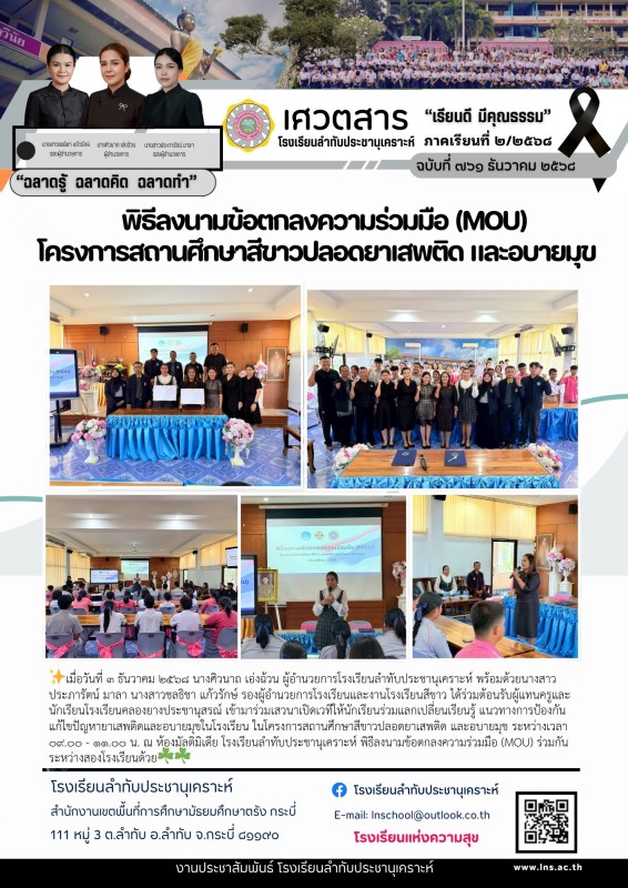รองผู้อำนวยการโรงเรียนและงานโรงเรียนสีขาว ได้ร่วมต้อนรับผู้แทนครูและนักเรียนโรงเรียนคลองยางประชานุสรณ์ เข้ามาร่วมเสวนาเปิดเวทีให้นักเรียนร่วมแลกเปลี่ยนเรียนรู้ แนวทางการป้องกันแก้ไขปัญหายาเสพติดและอบายมุขในโรงเรียน ในโครงการสถานศึกษาสีขาวปลอดยาเสพติด และอบายมุข ระหว่างเวลา ๐๙.๐๐ - ๑๑.๐๐ น. ณ ห้องมัลติมิเดีย โรงเรียนลำทับประชานุเคราะห์ พิธีลงนามข้อตกลงความร่วมมือ (MOU) ร่วมกันระหว่างสองโรงเรียนด้วย