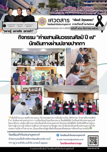 เมื่อวันที่ ๒๒-๒๓ พฤศจิกายน ๒๕๖๘ กิจกรรมกลุ่มสาระการเรียนรู้ภาษาไทย จัดกิจกรรม "ค่ายสานฝันวรรณศิลป์ ปี ๗" นักเดินทางผ่านปลายปากกา การเขียนร้อยแก้วและร้อยกรอง ณ