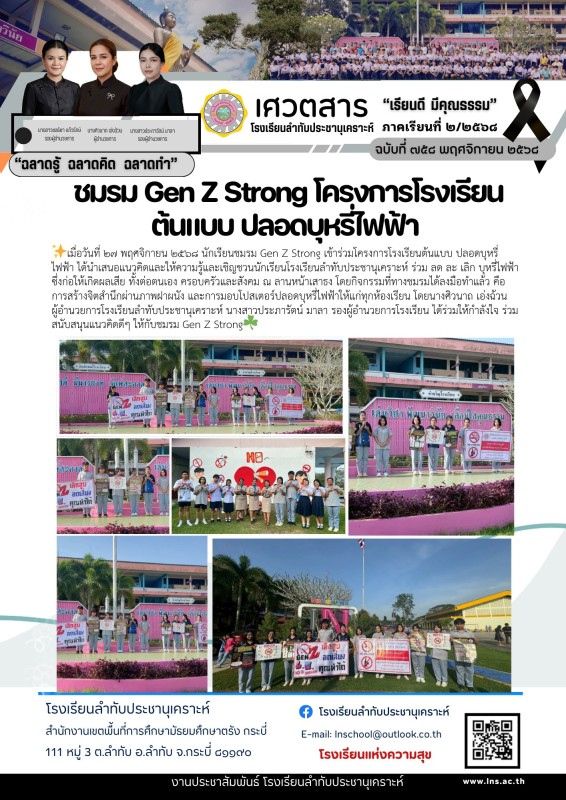 เมื่อวันที่ ๒๗ พฤศจิกายน ๒๕๖๘ นักเรียนชมรม Gen Z Strong เข้าร่วมโครงการโรงเรียนต้นแบบ ปลอดบุหรี่ไฟฟ้า