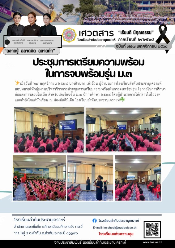 เมื่อวันที่ ๒๘ พฤศจิกายน ๒๕๖๘ นางศิวนาถ เอ่งฉ้วน ผู้อำนวยการโรงเรียนลำทับประชานุเคราะห์ มอบหมายให้กลุ่มบริหารวิชาการประชุมการเตรียมความพร้อมในการจบพร้อมรุ่น