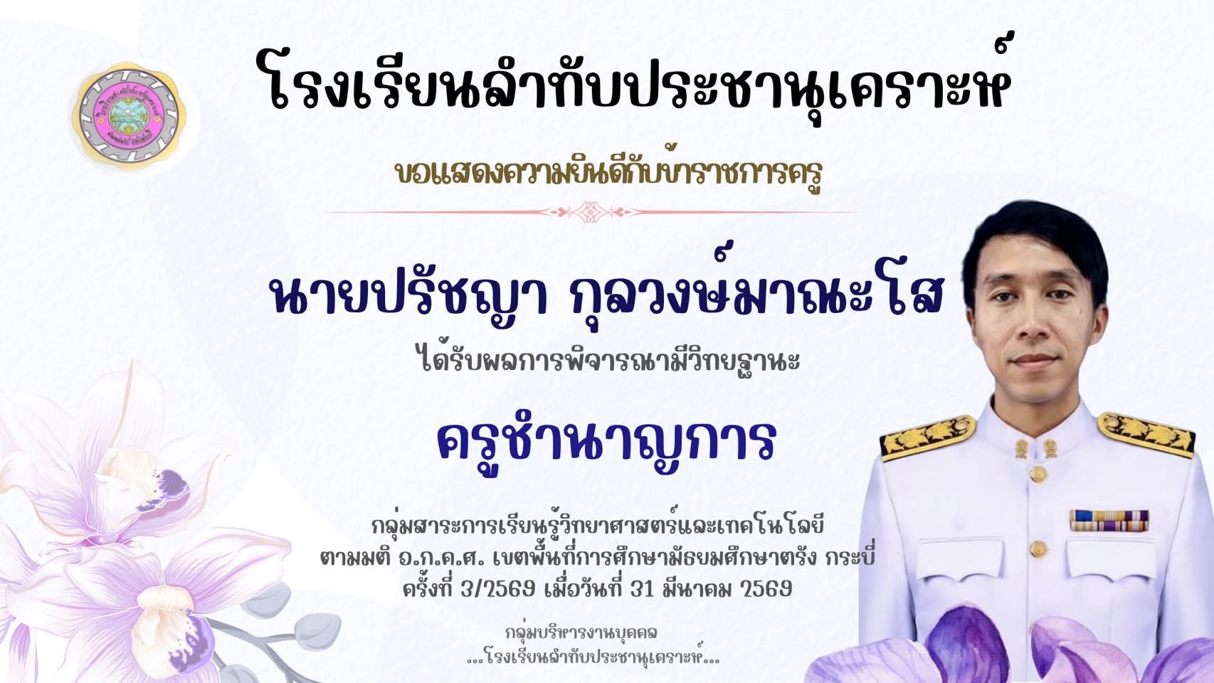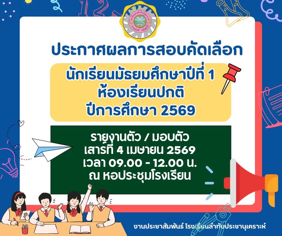 ✨โรงเรียนลำทับประชานุเคราะห์ ?ประกาศผลรายชื่อผู้มีสิทธิ์รายงานตัวและมอบตัวเข้าศึกษาต่อ ระดับชั้นมัธยมศึกษาปีที่ ๔ ปีการศึกษา ๒๕๖๙ ?ผู้มีสิทธิ์เข้าศึกษาต่อ รายงานตัว/มอบตัวในวันอาทิตย์ที่ ๕ เมษายน ๒๕๖๙